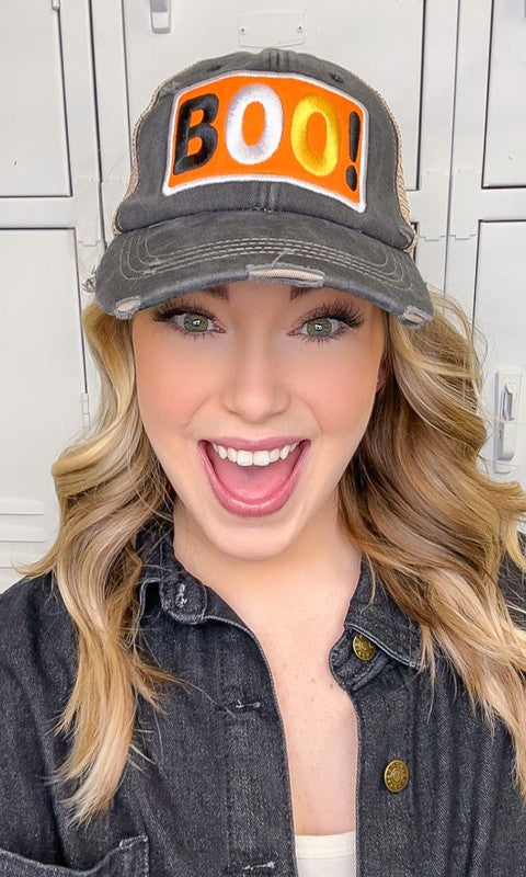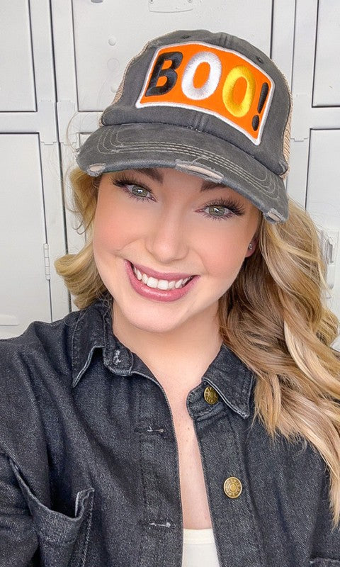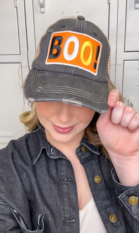 Hat features BOO! in a Halloween mix colored patch on a black vintage hat.