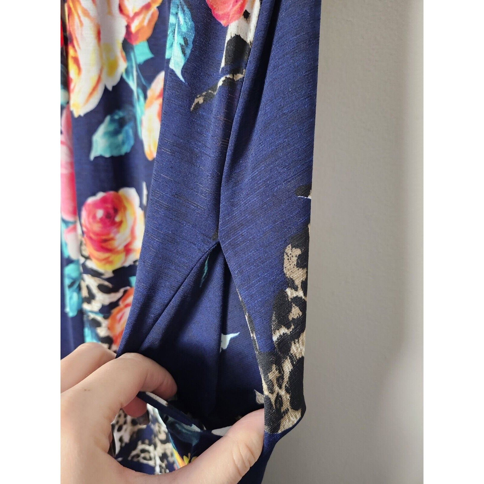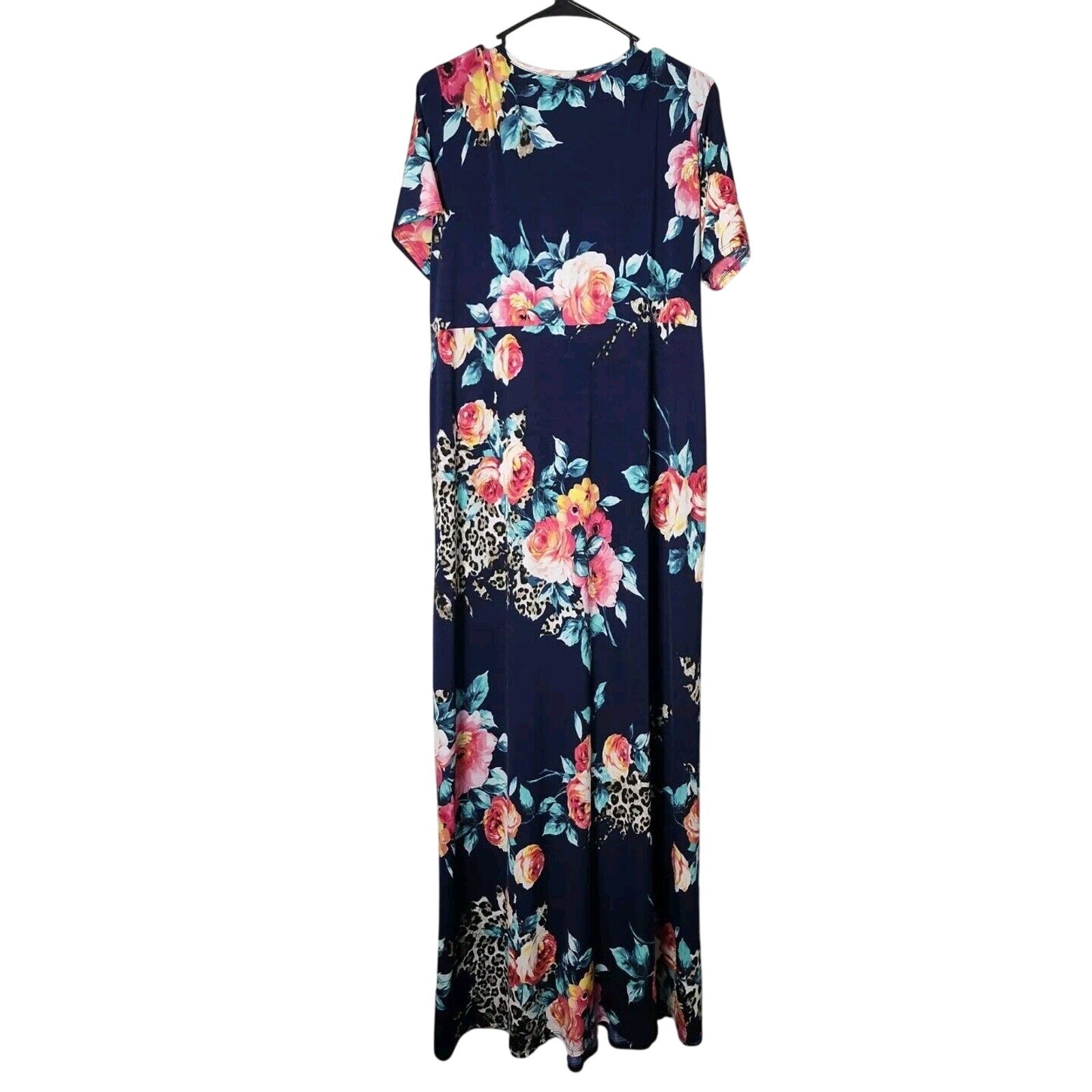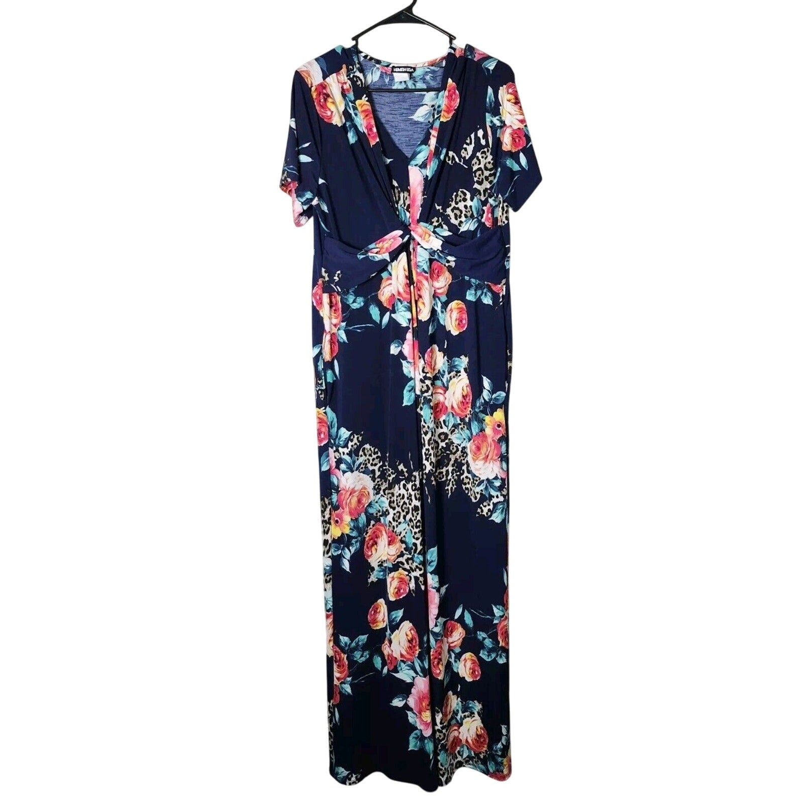 Heimish USA Maxi Dress Plus Size 2X Blue Pink Floral Animal Print Pockets V-Neck Short Sleeve
