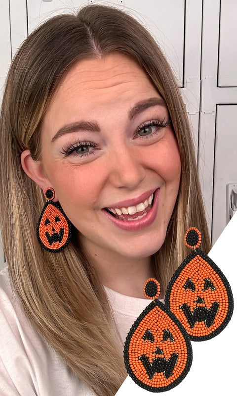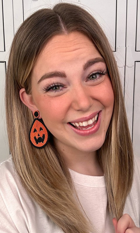 Earrings feature an orange beaded jack o lantern outlined with black beads in the shape of a teardrop.