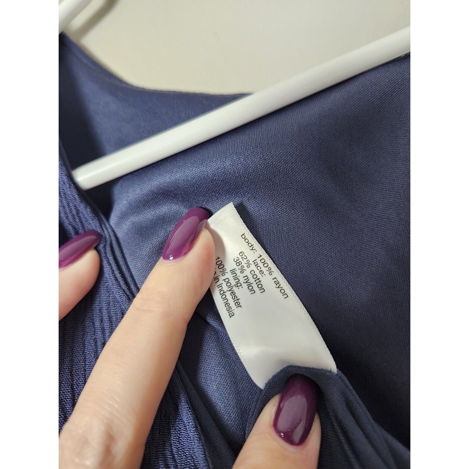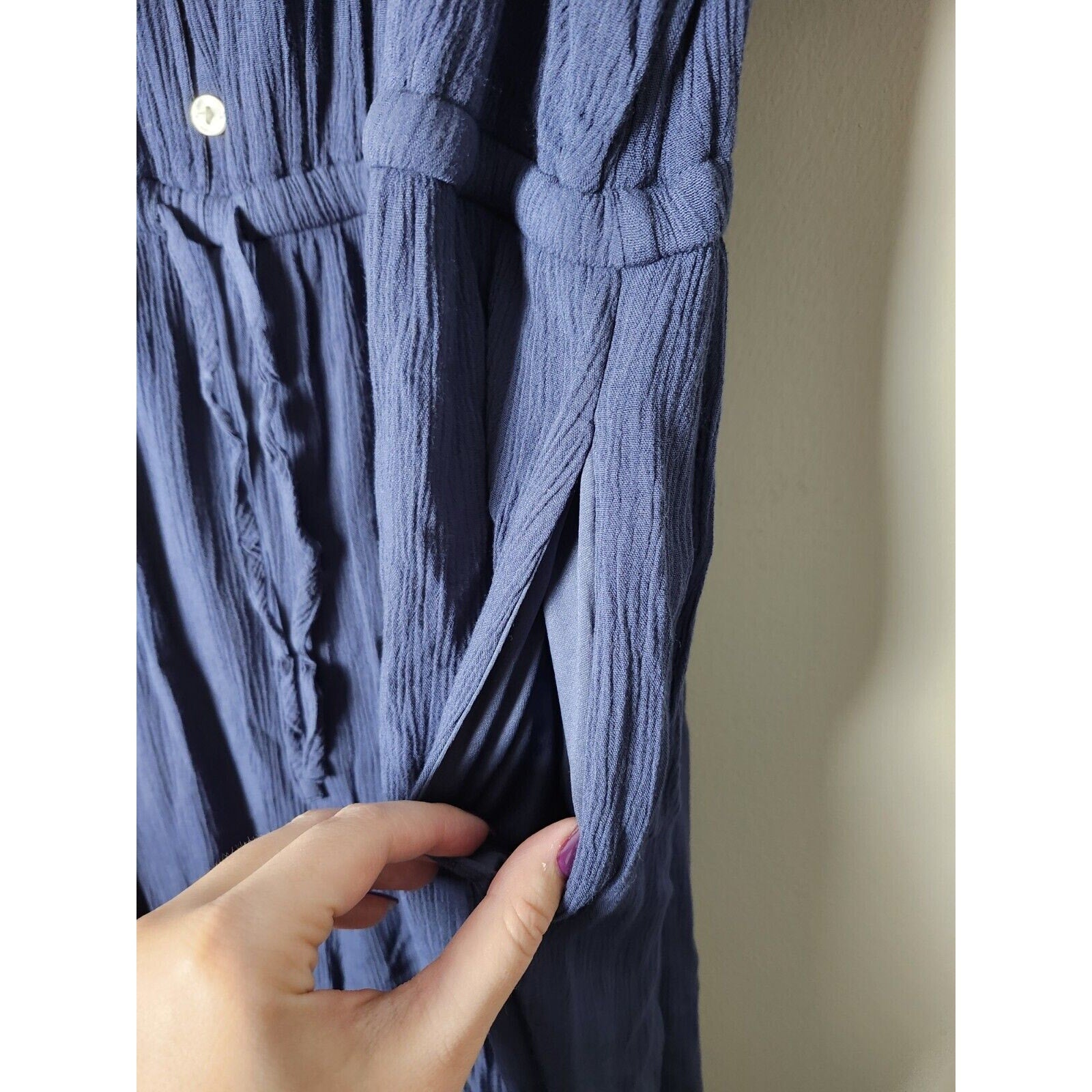 V-neck. Elbow sleeves with sheer lace. Button front. Pockets. Covered elastic waist with drawstring. Woven crinkle fabric. Single-button keyhole back closure.