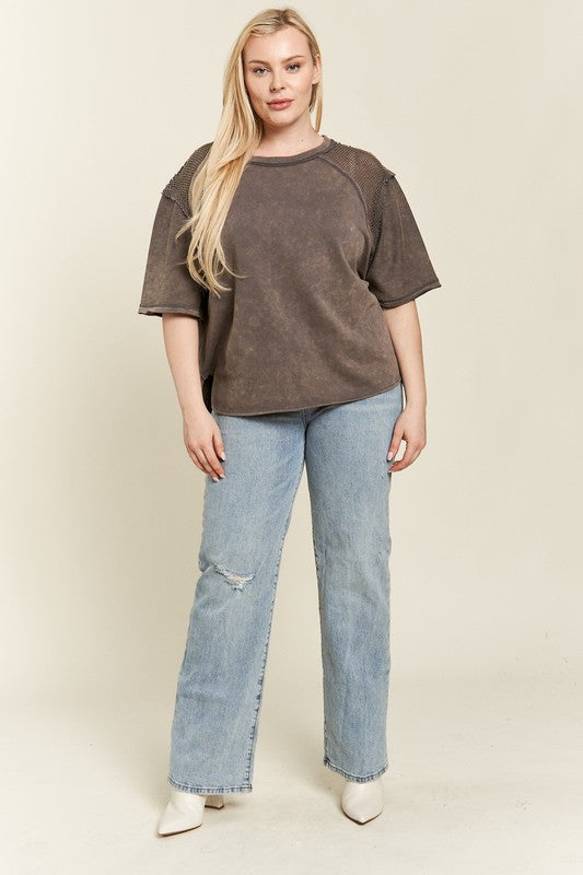 MINERAL WASHED SHORT SLEEVE FISHNET TOP