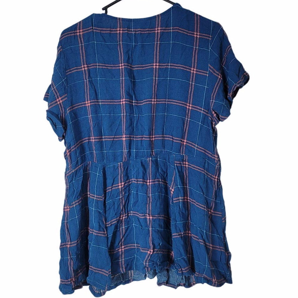 Torrid Babydoll Blouse Plus Size 1/1X Crinkle Gauze Crochet Lace-Up Blue Plaid